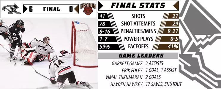 Hayden Hawkey stopped all 17 shots to earn his first shutout of the season and second of his career. Brown goaltender Gavin Nieto surrendered five goals in 45:22, while Connor Maher allowed one goal in the final 14:38.