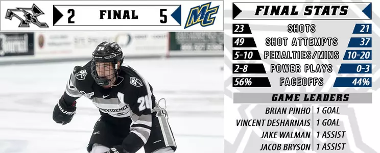 NORTH ANDOVER, Mass. - Tyler Irvine's pair of goals paced a five-goal third period for the Merrimack Warriors in a 5-2 win over the Providence College men's hockey team on Friday afternoon at Lawler Rink.